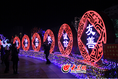 21日大年初三晚上,五蓮縣芙蓉廣場上點亮一片喜慶的紅色花燈。以“富強、民主、文明、和諧、自由、公正、法治、愛國、敬業、誠信、友善”標語為基礎特別設計的花燈格外奪人眼球,標語花燈中間的兩只白色山羊更是惟妙惟肖,引來市民爭相合影留念。
