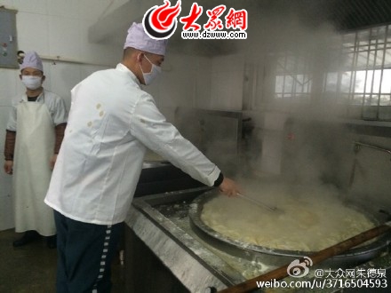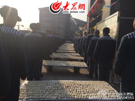 【高墻里的別樣除夕2】經過數道門衛,在干警帶領下走濟南監獄。此刻,服刑人員己包好水餃,正排隊等待下鍋。除夕24小時代班的黨委書記、監獄長劉敦臣說,為保障服刑人員生活權益、推行人性化改造管理,他們僅春節期間就投資40多萬改善伙食。生活管理處精心制定了節日食譜,除夕中午每人一只清蒸全雞。