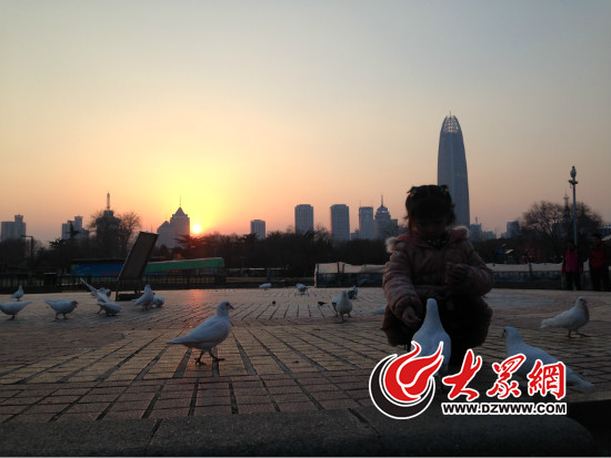 除夕傍晚,一個小女孩正在泉城廣場喂食和平鴿(大眾網記者韋輝 攝)