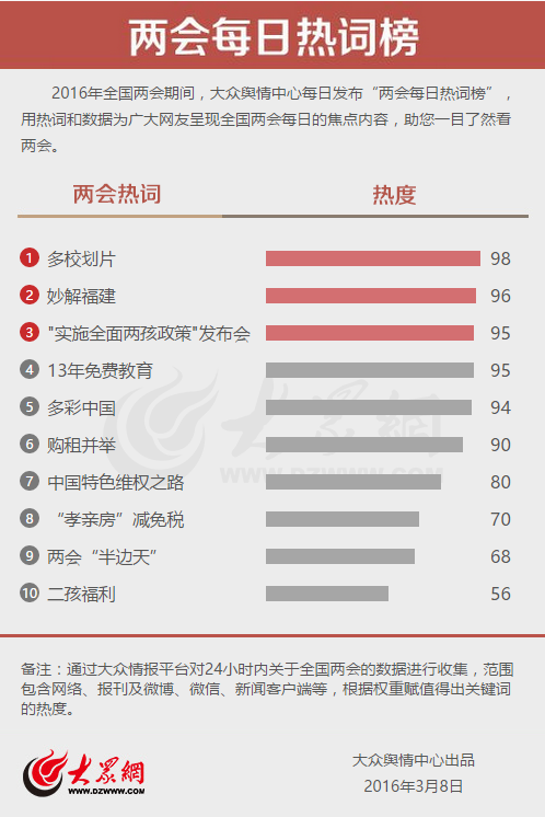 大眾網北京3月8日訊 (記者 劉欣 劉洪 宋瑋瑋)今天,大眾輿情中心發布第七期“兩會每日熱詞榜”。“多校劃片”“妙解福建”“‘實施全面兩孩政策’發布會”分別以98、96和95的熱度名列榜單三甲。