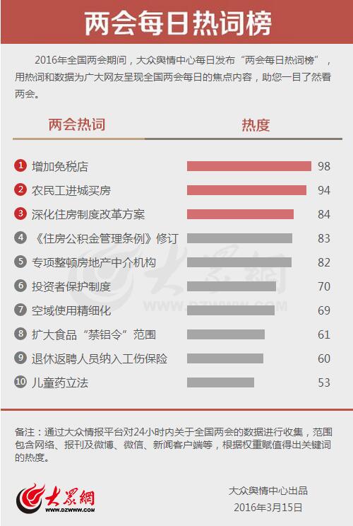大眾網濟南3月15日訊(記者 王曉光 劉洪 宋瑋瑋 )今天,大眾輿情中心發布第十四期“兩會每日熱詞榜”。其中,消費、房地產以及食品安全等領域的多個話題受到關注。“增加免稅店”“農民工進城買房”“深化住房制度改革方案”分別以98、94和84的熱度成為今日最熱詞。
