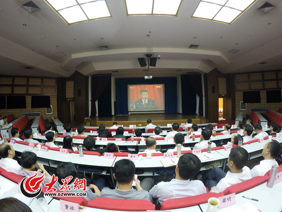 上午10:00,山東省委黨校第26期中青班學員們集合在教學樓報告廳,一起收看慶祝中國共產黨成立95周年大會直播。大家聚精會神、邊聽邊記,習近平總書記的講話不時引起報告廳內一陣陣熱烈的掌聲。