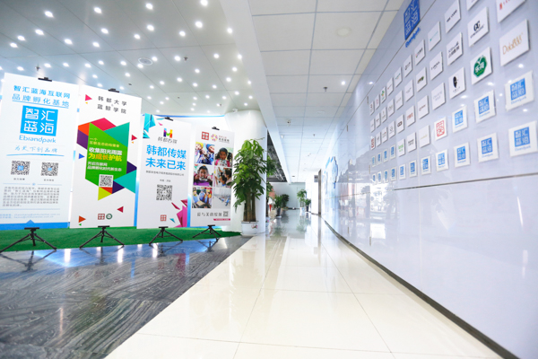 走進(jìn)韓都衣舍智匯藍(lán)海,首先引入眼簾的是墻壁上幾十個(gè)電商品牌標(biāo)識(shí)組成的矩陣。