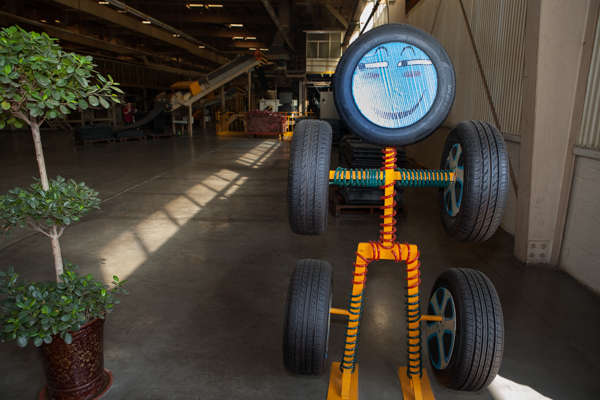 9月21日下午,媒體行西線采訪團走進山東萬達寶通輪胎的生產車間,一進門就看到“萌萌噠”輪胎卡通造型,十分可愛,把輪胎變“活”了(撒偉 攝)