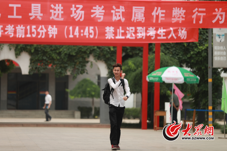 6月7日上午11點30分,隨著鐘聲的敲響,高考首日上午語文科目考試結束,在山師附中考點,一考生輕松走出考場,面對鏡頭擺出勝利的手勢。大眾網記者 王長坤 攝