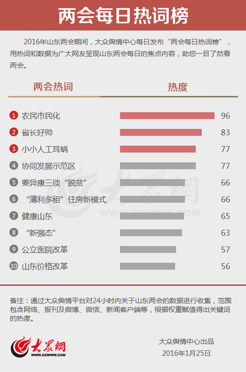 大眾網濟南1月25日訊(記者 劉欣 王曉光 宋瑋瑋)今天,大眾輿情中心發布第三期“兩會每日熱詞榜”。 “農民市民化”“省長好帥”“小小人工耳蝸”分別以96、83和77的熱度名列熱詞榜前三。