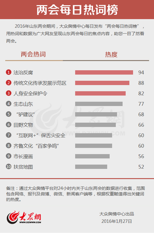 大眾網濟南1月27日訊(記者 劉欣 王曉光 宋瑋瑋)今天,大眾輿情中心發布第五期“兩會每日熱詞榜”。“法治反腐”“傳統文化傳承發展示范區”“人身安全保護令”分別以94、88和82的熱度進入熱詞榜前三名。