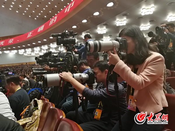 18日上午,北京人民大會(huì)堂二樓,記者們的“長(zhǎng)槍短炮”。