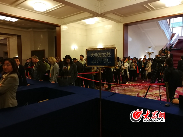 在人民大會(huì)堂二樓,大批中外記者排隊(duì)領(lǐng)取材料。