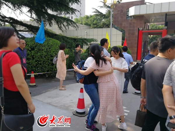 煙臺(tái)四中陪考老師擁抱學(xué)子 為考生加油助威