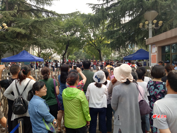 大眾網(wǎng)煙臺(tái)6月8日訊 (記者 屈晨晨 見(jiàn)習(xí)記者 邢莉莎) 6月8日,2018夏季高考第二天,上午8點(diǎn)20分,在煙臺(tái)一中考點(diǎn),為了給考生們加油打氣,很多家長(zhǎng)和老師自覺(jué)站在過(guò)道兩邊,目送考生有序進(jìn)入考場(chǎng)。
