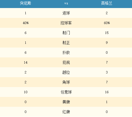 第78分鐘,英格蘭獲得罰球弧頂?shù)娜我馇颍⑹怖?揚主罰射門打高。第91分鐘,特里皮爾開出右側角球,馬奎爾頭球擺渡,無人防守的凱恩左肋5碼處頭球破門。最終,英格蘭2-1突尼斯。
