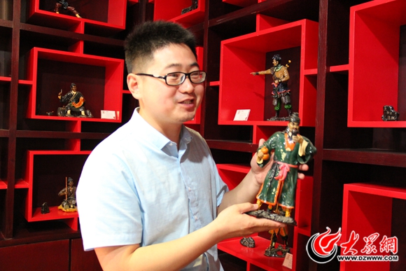 在穆李村曹州面塑藝術館,面塑藝人李震報向記者展示他的作品