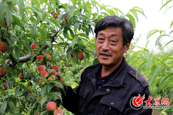 穆李村老果農李傳進在他種的果園里向記者展示即將成熟的桃子