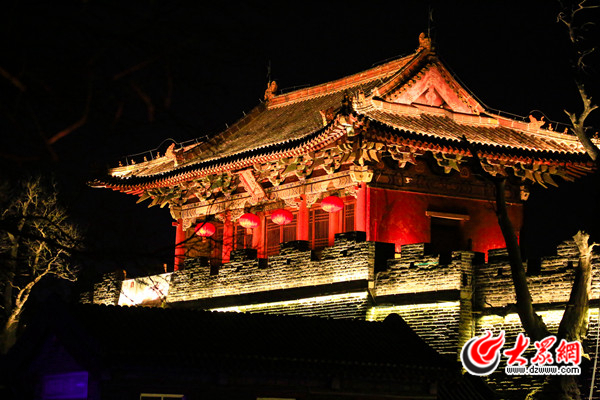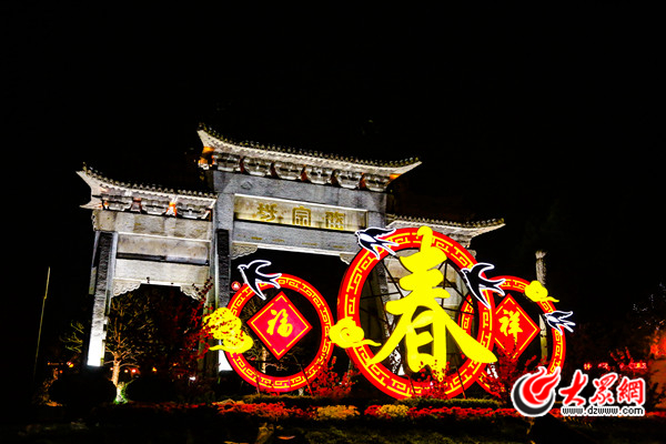 圖為泰山東街一角,雕刻的巨龍在燈光的照射下栩栩如生。