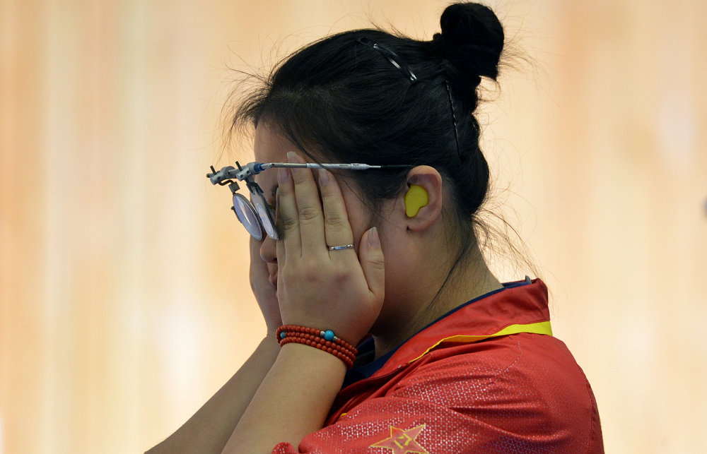 女子10米氣手槍預(yù)賽,一名選手賽后難掩失落之情。