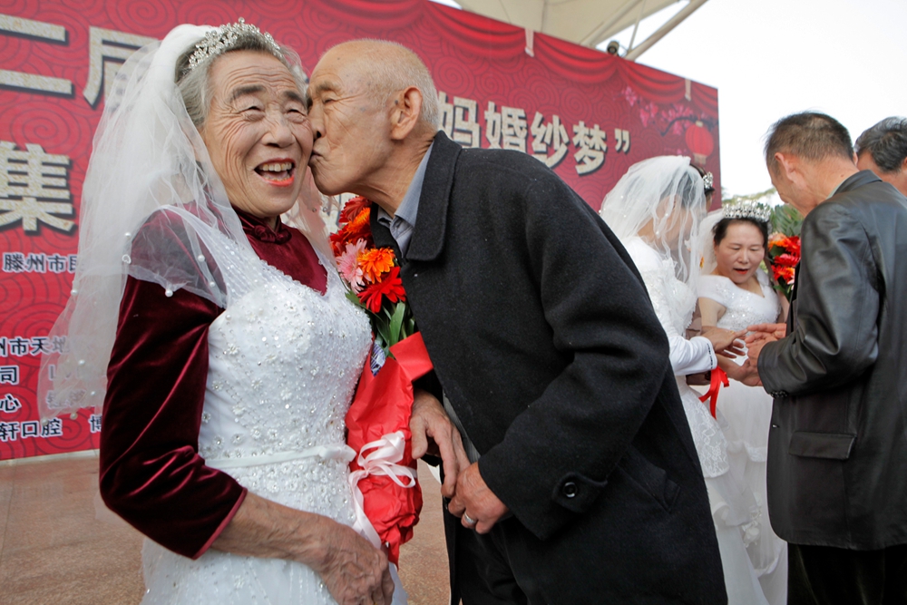 10月28日,山東省滕州市一位82歲的裴志敬老人正在親吻陪伴他已經60年的妻子黃奇秀。