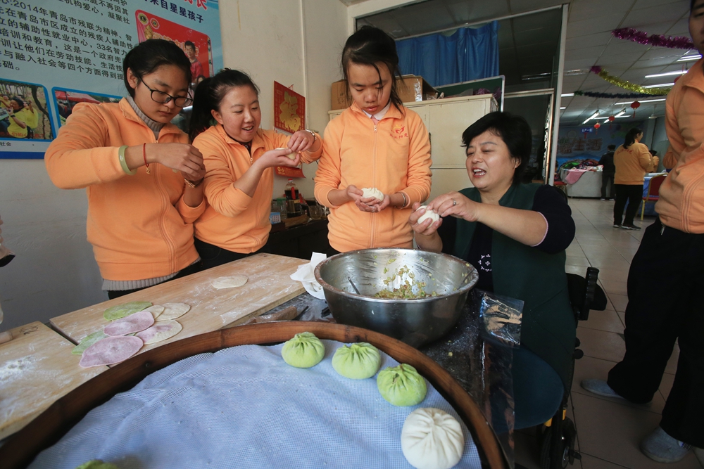 中心的老師和楊萍一起教孩子們各種生活技能。