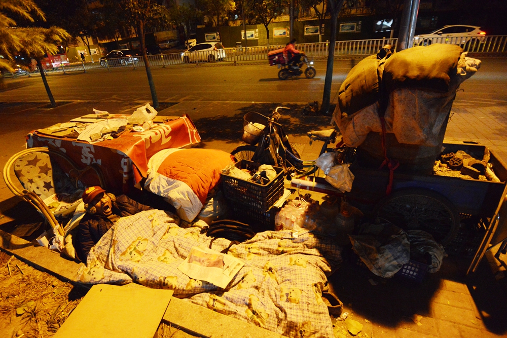 深夜11點,氣溫接近零攝氏度,老殷在路邊搭起了被窩,鉆進后打了一個呵欠。