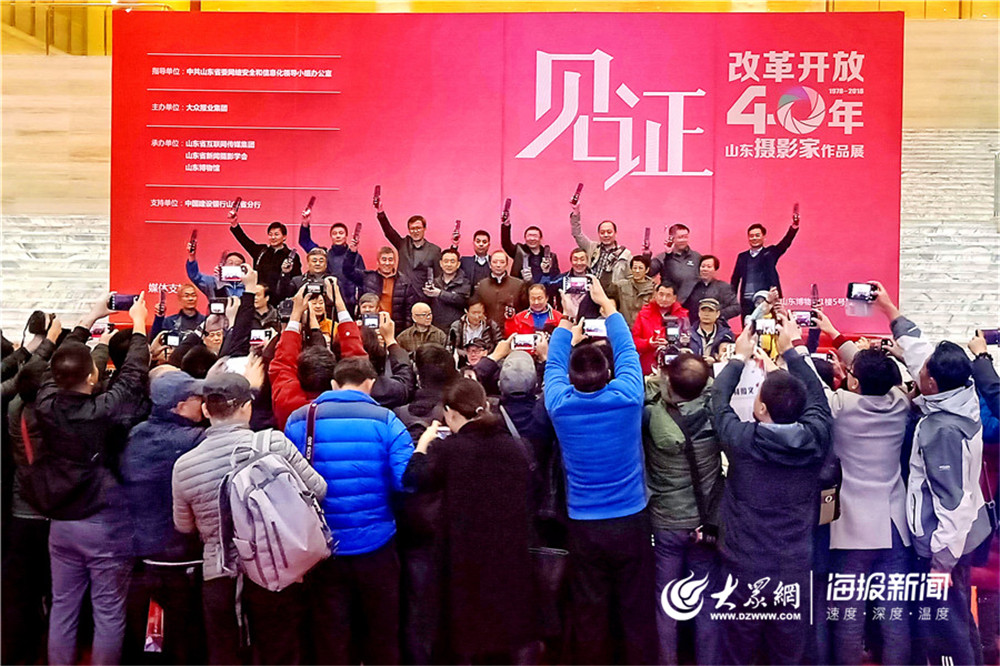 2018年12月17日上午,見證——改革開放40年山東攝影家作品展在山東博物館開幕。本次攝影展以“見證”為主題,對111位攝影家的245幅攝影作品進行集中展覽,全景式回顧改革開放40年的歷史進程,展現走進新時代的山東實踐。圖為:2018年12月17日 見證--改革開放40周年山東攝影家作品展在山東博物館開幕。首批四十名大眾視覺影像庫簽約專家在開幕式合影,大眾視覺影像庫建設進入新的里程碑。大眾網 作者 楊振勇 李百軍 王劍 錢程 編輯 張峰 董飛