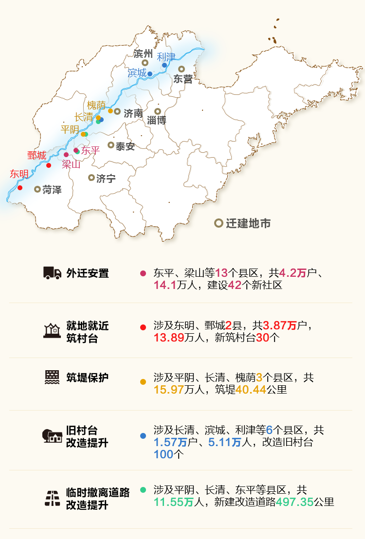 遠離洪災、擺脫貧困、實現富裕是灘區人民的希望;搬離房屋簡陋、交通不便的舊村居,住進生態宜居、功能完備的新社區是灘區人民的夢想。山東因地制宜,分類施策,計劃總投資260.06億元,通過外遷安置、就地就近筑村臺、筑堤保護、舊村臺改造提升、臨時撤離道路改造提升等5種方式,實施黃河灘區居民遷建工程。其中,外遷安置人口14.10萬人,就地就近筑村臺安置13.89萬人,筑堤安置15.97萬人,舊村臺改造提升安置5.11萬人,采用臨時撤離措施安置人口11.55萬人。