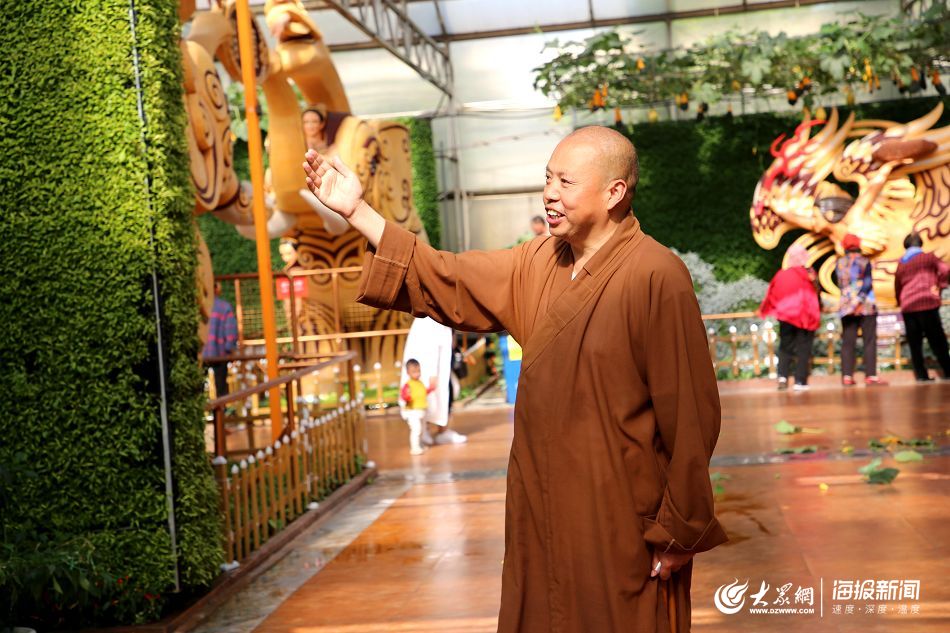 延參法師在壽光菜博會(huì)現(xiàn)場(chǎng)直播,向網(wǎng)友介紹菜博會(huì)景觀。
