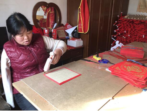 近日,大眾網記者來到西齊家屯村村民王德濤家中,這里是村民們學習制作中國結的固定地點,王德濤負責教,村民學會后可帶著材料回自家制作零部件,然后回來一起組裝。“家里空間有限,一般能帶回去做的就讓她們帶回去做!蓖醯聺嬖V記者。記者看到,在這個只有十幾平的小屋子里,整整齊齊地擺放著各種零配件和制作工具,紅彤彤的十分喜慶,充滿了新年的氛圍。“這些中國結有65厘米寬,130厘米高,全是純手工制作的,有普通款,也有特別定制款,客戶想要什么樣的我們都能做出來!蓖醯聺嬖V記者。