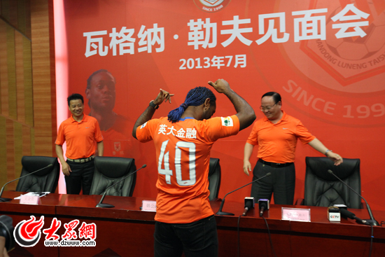 今天下午,魯能泰山俱樂部為來自巴西的魯能新外援瓦格納·勒夫舉行了媒體見面會。勒夫在見面會上展示了他的40號球衣,隨后回答了記者的提問,并接受了大眾網網友和球迷贈送的禮物。