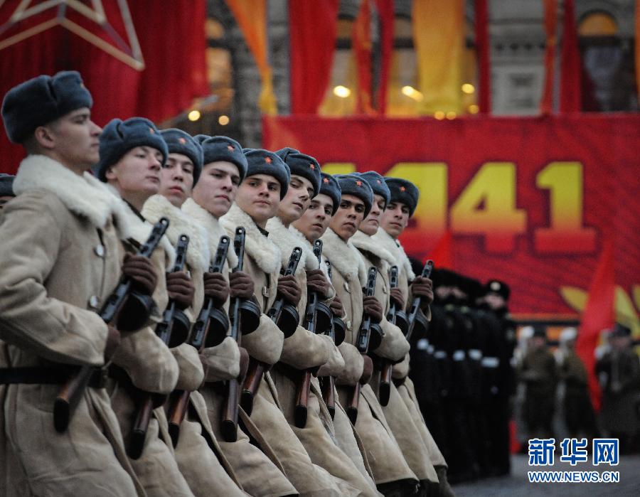 11月7日,在俄羅斯首都莫斯科,參加閱兵活動的士兵方陣走過紅場。當日,莫斯科紅場舉行復古式閱兵,紀念1941年紅場閱兵72周年。1941年11月7日,蘇聯紅軍在衛國戰爭最艱難的時刻于紅場舉行了盛大的閱兵儀式。參加閱兵式的部隊在閱兵完畢后直接開赴前線與德軍作戰。新華社記者戴天放攝