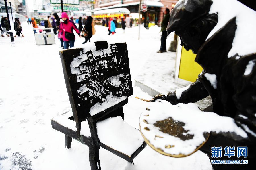 11月18日,游客們在哈爾濱市中央大街游覽。今冬首場暴雪讓冰城哈爾濱成了白色的世界,不少游客和市民專程在大雪紛飛中前往哈爾濱市一些著名景點,在雪中欣賞“冰雪之都”的美麗景色。新華社記者王凱攝