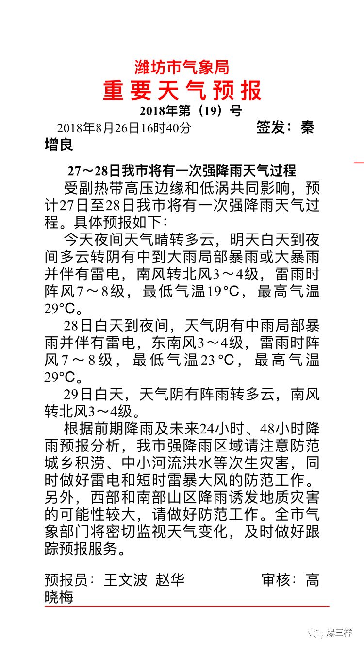 受副熱帶高壓邊緣和低渦共同影響,預計27日至28日濰坊市將有一次強降雨天氣過程。具體預報如下: