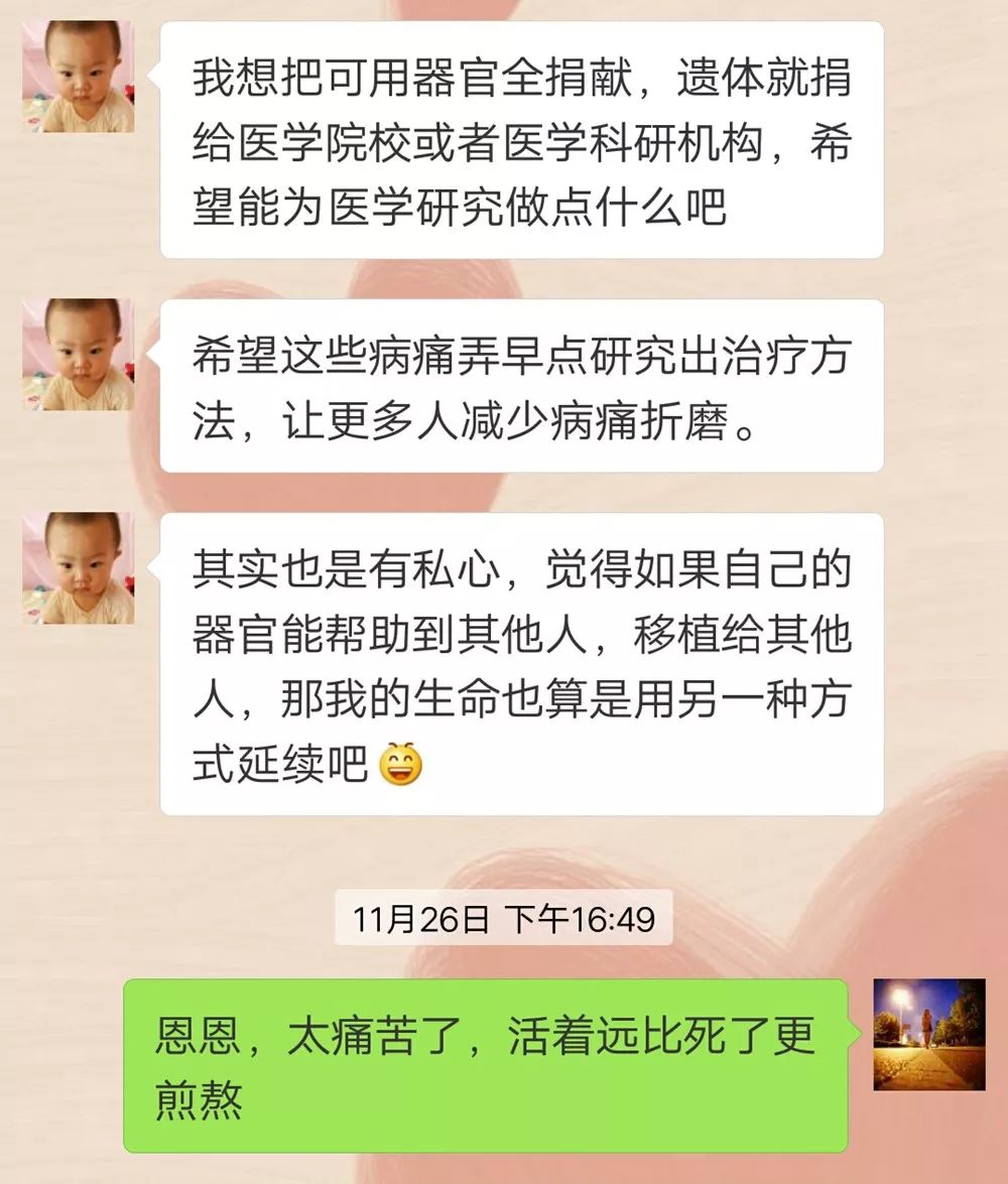 她柔弱的氣息,柔弱的肩膀,已經(jīng)承擔(dān)不起癌癥的折磨和命運(yùn)的不公。4次化療剝奪了她的秀發(fā),憔悴蠟黃的面色之下是一顆善良、勇敢的心“我生病的時(shí)候,有太多人幫助過我,我沒法當(dāng)面對他們說一聲謝謝······我死了,把能用的器官捐出去,遺體做研究,希望能做點(diǎn)什么吧。”