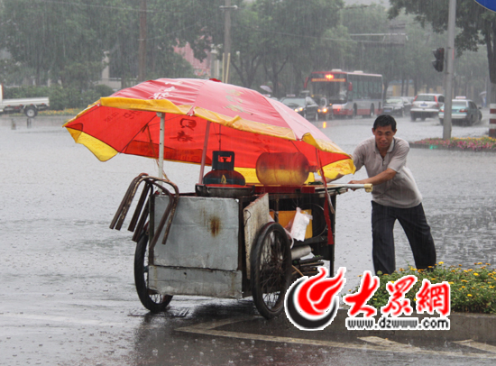今天中午,市民劉先生相約和同事出門吃午飯,卻發(fā)現(xiàn)豆大的雨點從天而降,即便開著汽車開啟雨刷,但能見度依然很低。在歷山路、濼源大街上很多車輛打開應急燈緩慢通行,沿街攤點冒雨收攤。