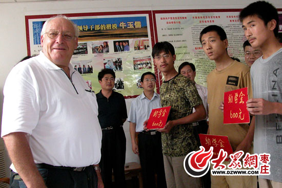2005年7月29日,諾博為貧困生發放助學金。(資料圖)