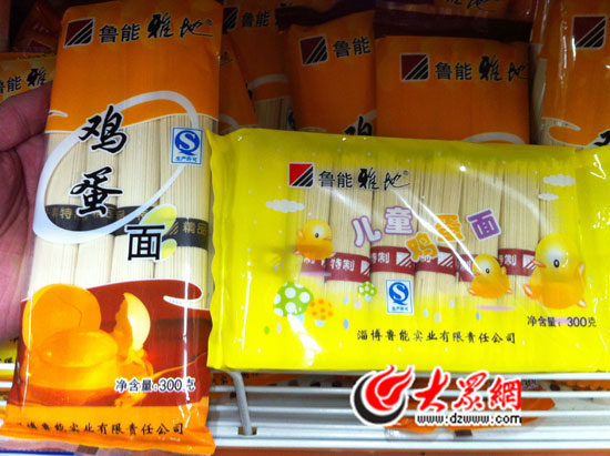 兒童食品是否真如她所言?大眾網記者隨后選取了多個品牌的面條對比發現,兒童面條在包裝上都很“迷你”,不少牌子還加入了五顏六色的蔬菜汁,看起來更漂亮,然而實際成分并無差別:大眾網記者找到一款魯能雅地的300克包裝兒童面條,與旁邊貨架上的300克普通面條對比,二者粗細差不多,成分也完全一樣,都是小麥粉、鮮雞蛋和食用鹽,但是售價分別為5.3元和4.3元,兒童版的面條比普通面條一包貴一塊錢。