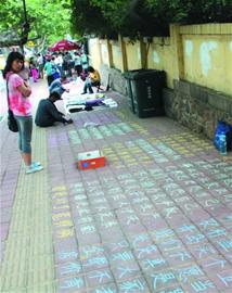 隨著網(wǎng)絡的日益發(fā)達,很多人都通過在網(wǎng)絡上開博客、手機上“織圍脖”來記錄自己的生活,敘述自己的所思所感。青醫(yī)附院旁邊的人行道已經(jīng)被他寫滿了,他準備寫完江蘇路后順延到太平路上去寫。