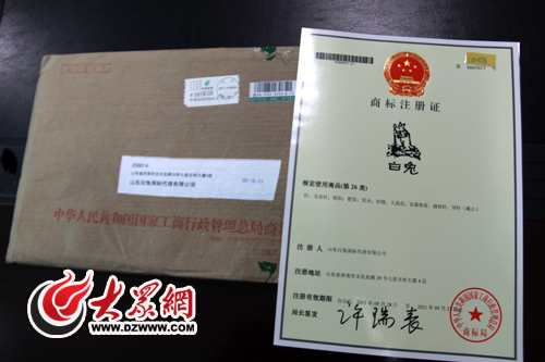 11月1日,山東白兔商標代理公司收到了國家工商總局寄來的商標注冊證。