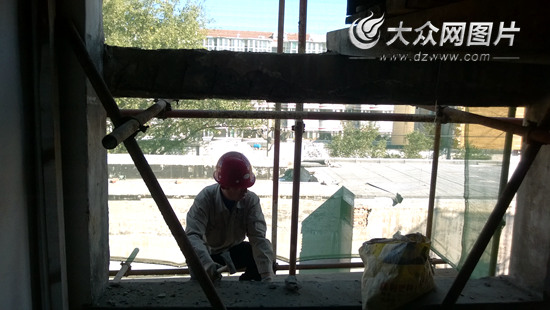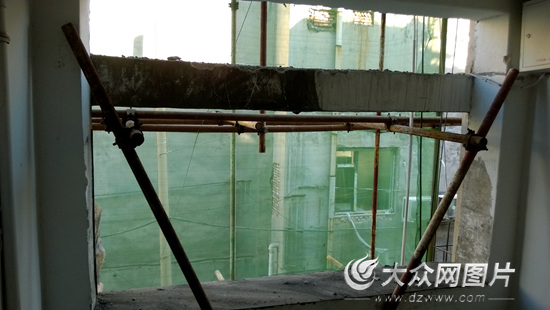 濟(jì)南“膠帶樓”第二單元的開(kāi)裂水泥窗欞已經(jīng)拆除完畢,將安裝窗戶(hù)。記者 馬俊驥 攝