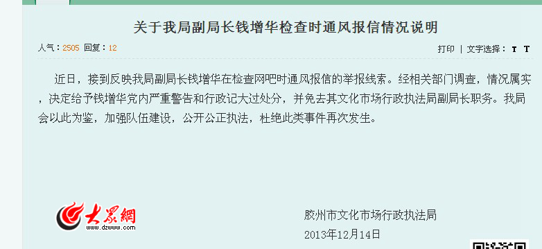 隨后,大眾網記者在12月14日公開發布的《關于我局副局長錢增華檢查時通風報信情況說明》上看到如下處理結果:近日,接到反映我局副局長錢增華在檢查網吧時通風報信的舉報線索。經相關部門調查,情況屬實,決定給予錢增華黨內嚴重警告和行政記大過處分,并免去其文化市場行政執法局副局長職務。我局會以此為鑒,加強隊伍建設,公開公正執法,杜絕此類事件再次發生。該說明的落款為:膠州市文化市場行政執法局。