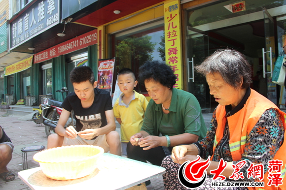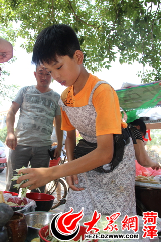 早晨7點多,大眾網記者在單縣湖西南路旁邊的涼皮攤見到了王書陽。橙色的T恤加長褲,戴著圍裙,他的臉面干凈而俊俏!班忄忄猓 笔炀毜厍兄粡垙垱銎ぃ衅ぁ⑶忻娼、加作料、加涼水……盡管才擺了兩天地攤,但他的“動作”已相當嫻熟,小書陽說“這都是爸爸癱瘓后自己天天做飯練出來的”。