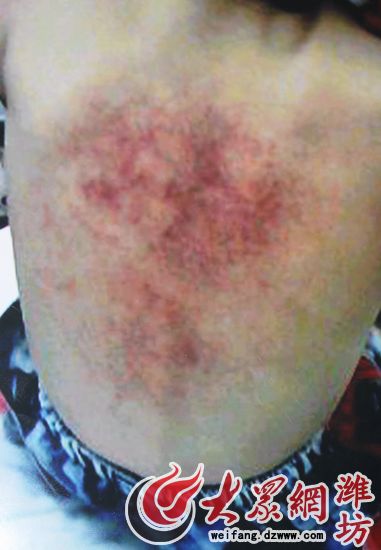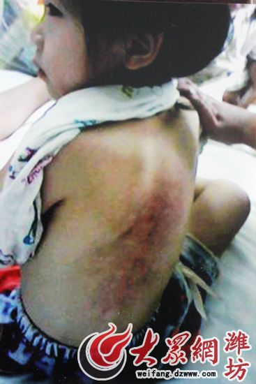 7月11日下午6:30,郝女士的丈夫劉先生接女兒樂樂回家,從幼兒園到家中,樂樂一直哭著在喊疼,劉先生問她哪里疼,樂樂卻一直不說,在劉先生的一直追問下,樂樂嘴里就說出兩個字:“背疼。”劉先生趕忙掀開衣服,當看到女兒背上大片的淤青都泛了紫,劉先生和郝女士都驚呆了。郝女士心疼的掉著眼淚,急忙問女兒背上的傷是哪里來的,但樂樂就是不說,郝女士一直哄著女兒,終于樂樂開口說了事情的經過。