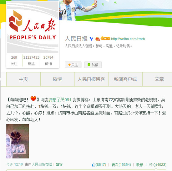 人民日報轉(zhuǎn)發(fā)網(wǎng)友微博 短時間內(nèi)被網(wǎng)友大量轉(zhuǎn)載