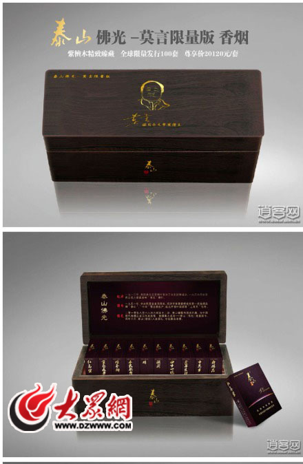 大眾網(wǎng)濟(jì)南12月19日訊(記者 王磊)近日,一則莫言將為山東煙草品牌“泰山佛光”代言的傳言引發(fā)網(wǎng)友熱議。有網(wǎng)友爆料稱,即將推出“莫言限量版”香煙,每支煙均以《紅高粱》、《檀香刑》、《生死疲勞》等10部莫言小說命名,并采用了極為奢華的紫檀木包裝,限量銷售100套,每套售價20120元。