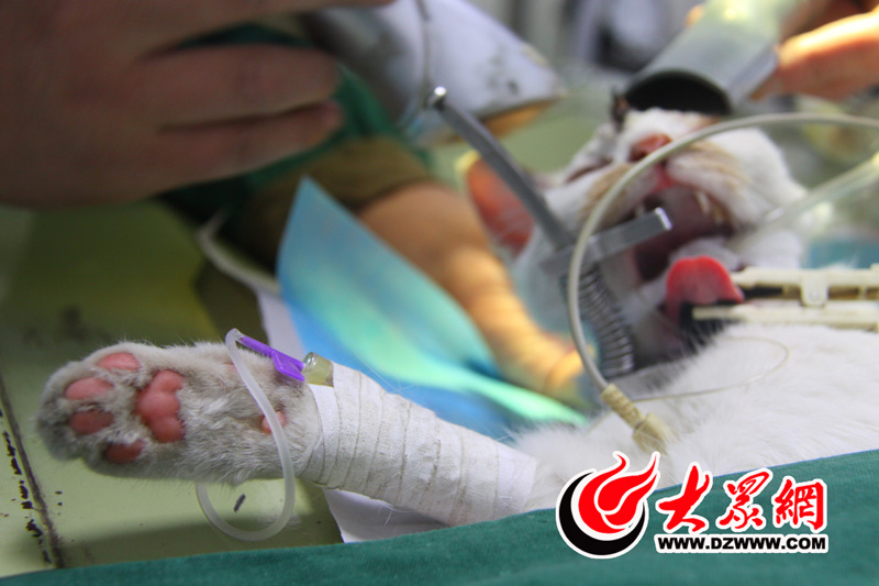 花花全身被夾上測量心跳、血壓、等得小夾子,嘴巴被固定住,并且插上了氧氣管。