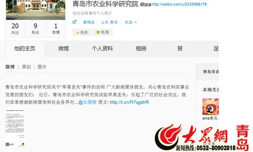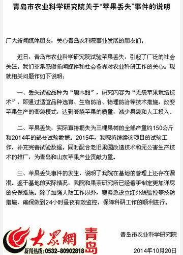 青島市農(nóng)科院官方微博關(guān)于“蘋果丟失”事件的說明