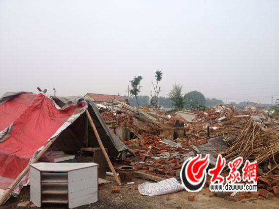 7月4日,金溝子村拒拆戶被村民集體強拆后,在老屋旁搭起帳篷,但帳篷里并無人居住。大眾網記者 李兆輝 攝