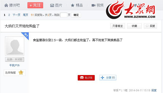 從4月11日開始,以滕州百度貼吧為主,部分網友發帖稱滕州食鹽由原來的每袋1.2元漲到了2.5元,不少市民都去超市搶鹽。大眾網記者注意到,最先在百度貼吧滕州吧發帖的是一名叫做“平民戶外”的網友,他于4月11日下午發布消息稱:“食鹽要漲價到2.5一袋,大媽們都去搶鹽了,再不搶就下架換新品了。”接著,網友“逍遙地瓜啦啦啦 ”跟帖說:“大哥,準確消息是三塊。”網友“滕州杰杰 ”則解釋說:“那是低鈉鹽,普通鹽還是那個價格。”