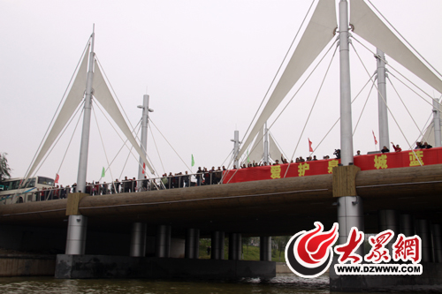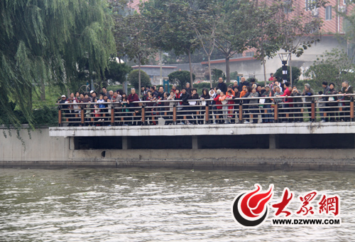 橫跨小清河的橋梁上站滿了觀看通航的市民。