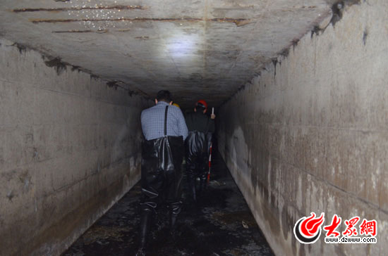 違規排放的污水從這個雨水泄洪涵洞流向護城河。圖為環保、市政部門工作人員戴著防毒面具進入涵洞探查排污口。