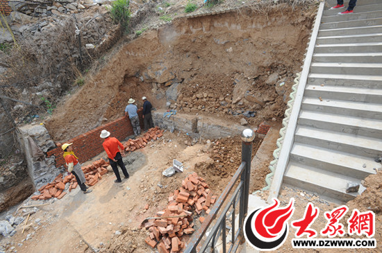 施工人員正在現場施工,背后山體巖石裸露,臺階地基被挖空(張中 攝)